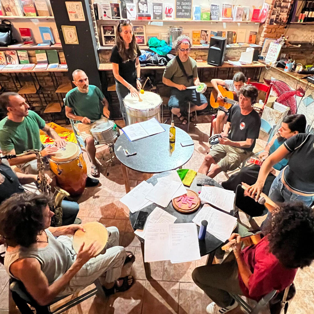 La formazione propone una roda de samba, forma tradizionale e informale di fare musica in cerchio, dove chi suona e chi ascolta condividono lo stesso spazio, tra voce, percussioni e partecipazione collettiva.